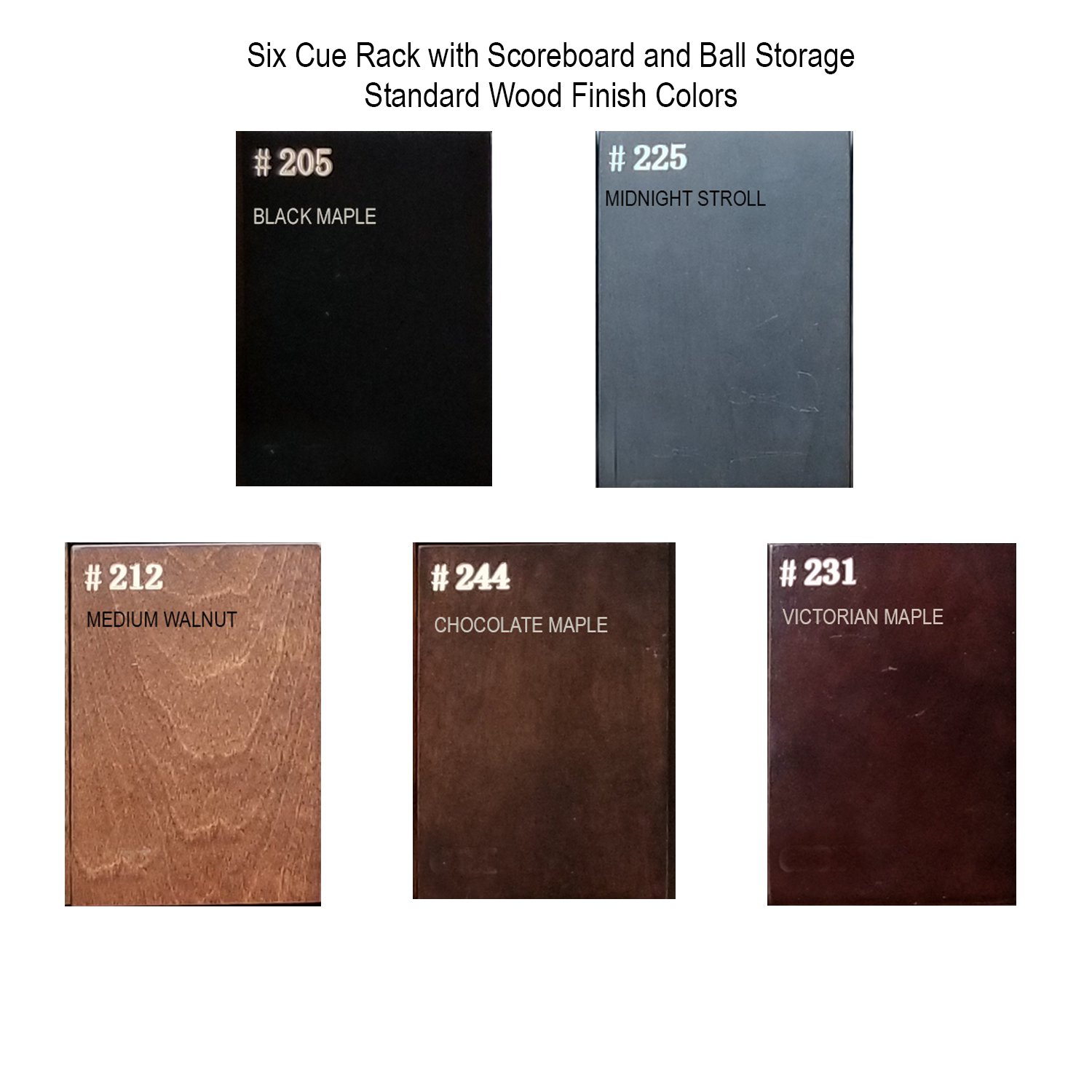 - Made to hold five cues, one bridge stick, two sets of balls, and has a chalkboard and a scoreboard