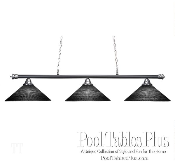 Oxford Billiard Light is shown in Chrome & Matte Black with three 16″ Black Matrix Glass Shades. Available in a variety of metal finish colors and choices of glass shades.