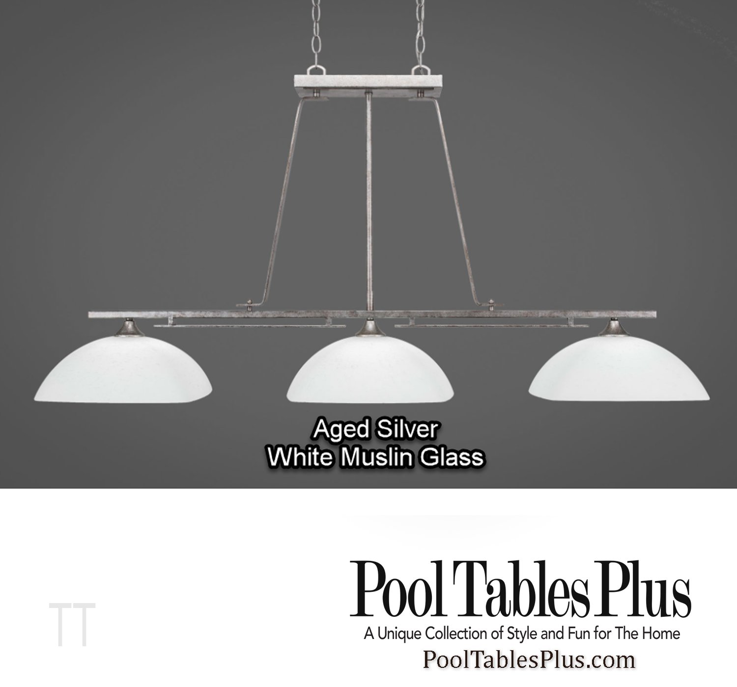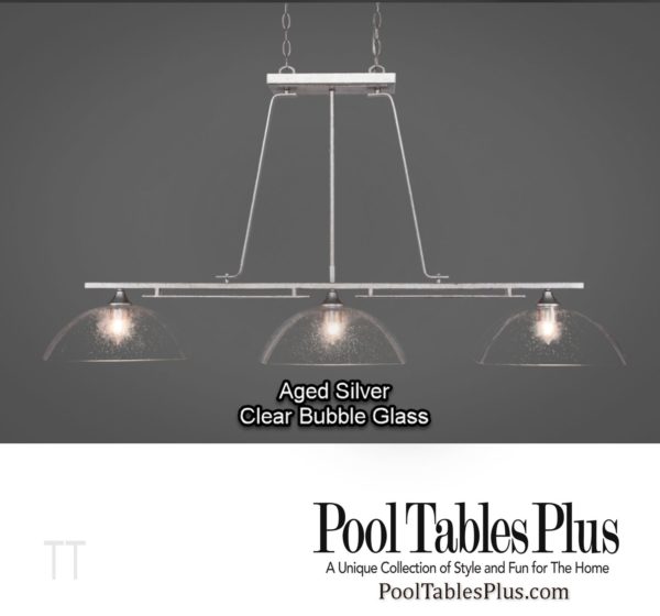 Our Uptown Light is shown in a aged silver metal with clear bubble glass shades.