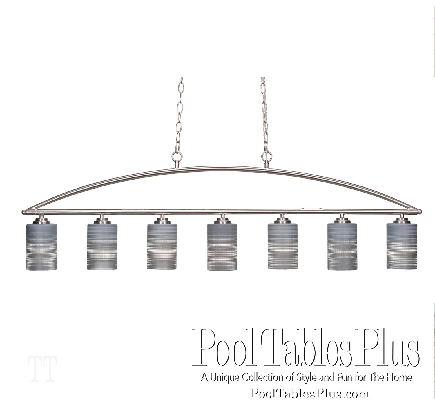 Our Marquee-7 light in shown in Brushed Nickel with 4″ Grey Matrix Glass. It looks amazing over a pool or shuffleboard table. Also available in Brushed Nickel finish.