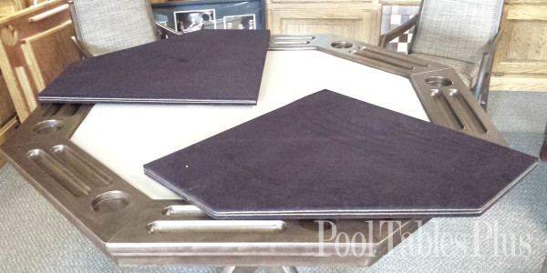 Card Table Dining Tops also offer a decorative presence that can highlight the colors of your room. Our Table Tops are available in any size, shape and over a dozen finish colors. Our Card Table Dining Tops come in 2 interlocking sections that uses a MagnaLok to hold them together. They can be custom made to fit round or octagon shaped card tables. Each side folds in half to allow for easy storage. The underside is lined with a felt color of your choosing and lays directly on the top rails of your card table. Our table top covers, with their durable yet elegant materials, their solid core fiber-board construction, and, of course, their patented MagnaLocâ„¢ perfectly fitted locks, make our pads your best choice for table protection!