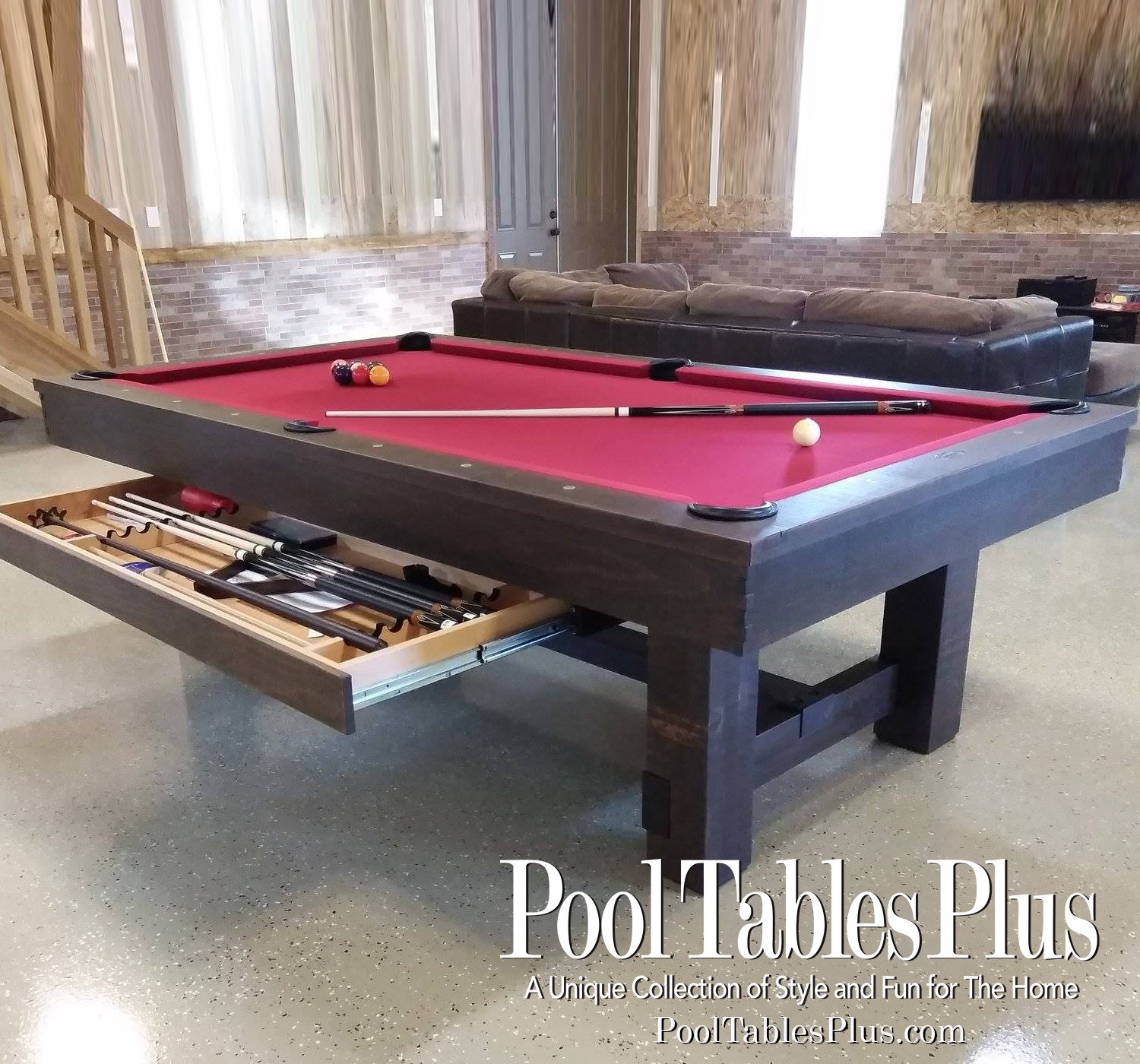 Matching shuffleboard tables and cue racks are available.
