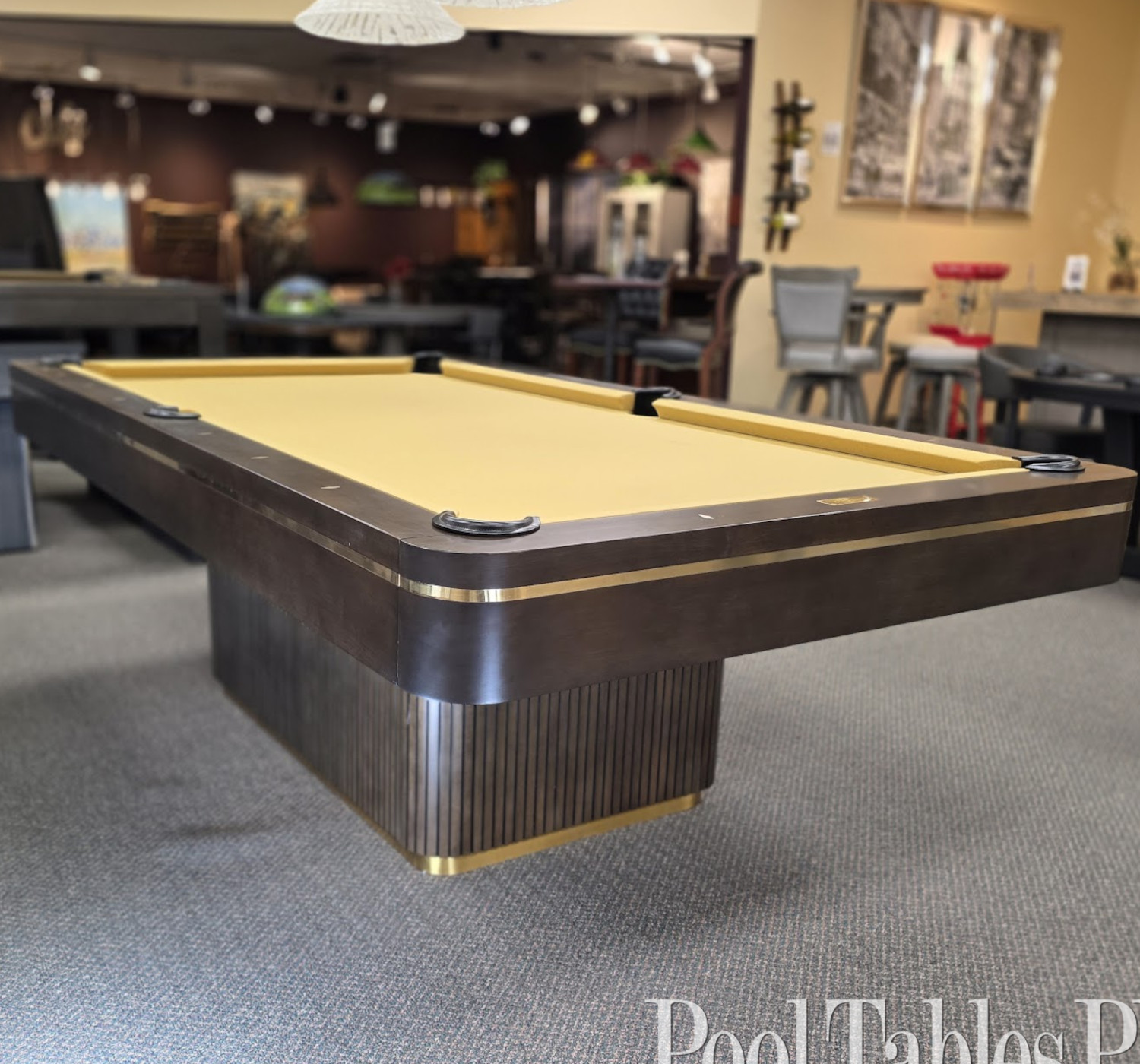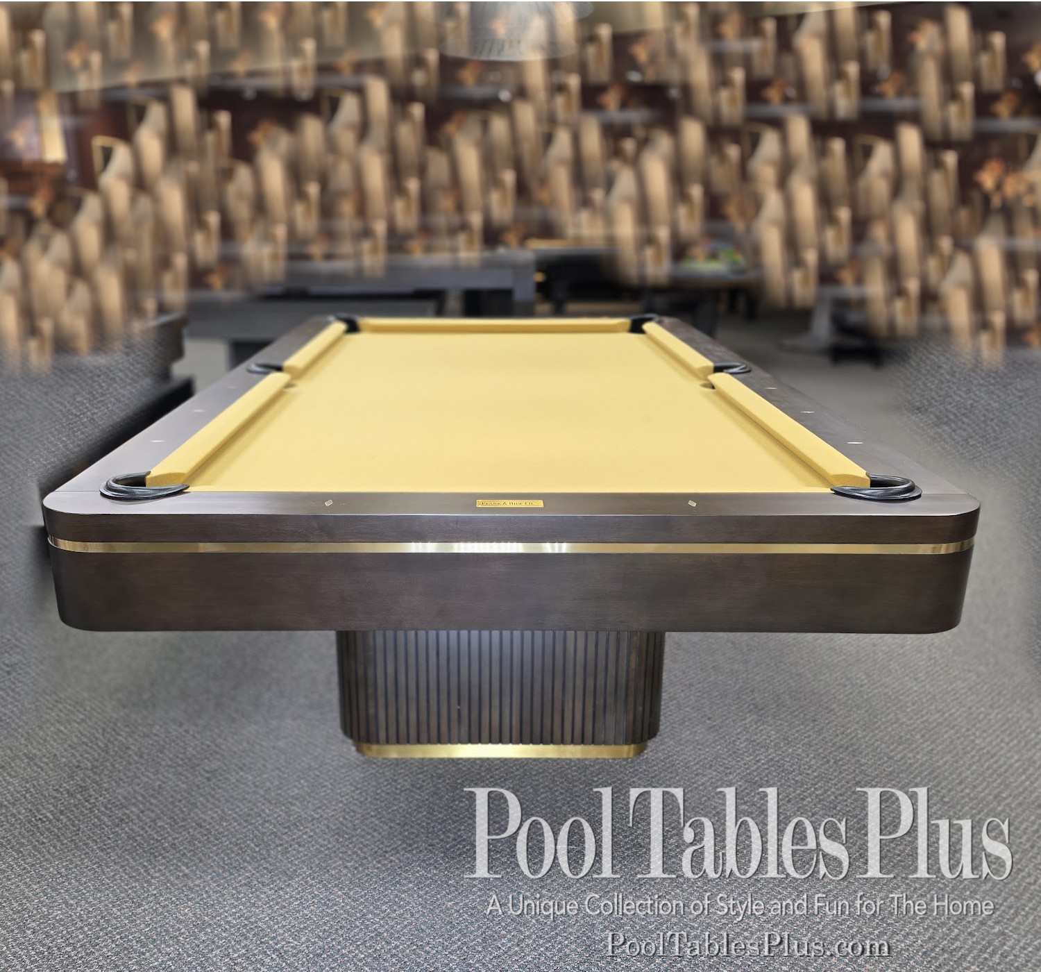 The Chrysler 8′ Pool Table is made in a stunning brushed greige finish with brass accents. This table combines modern design with a classic Art Deco-inspired aesthetic. The reeded wood base pedestal gives it a unique presence, adding both texture and depth to the overall design. The Chrysler is crafted from hardwood with a 1-inch, three-piece slate playfield.