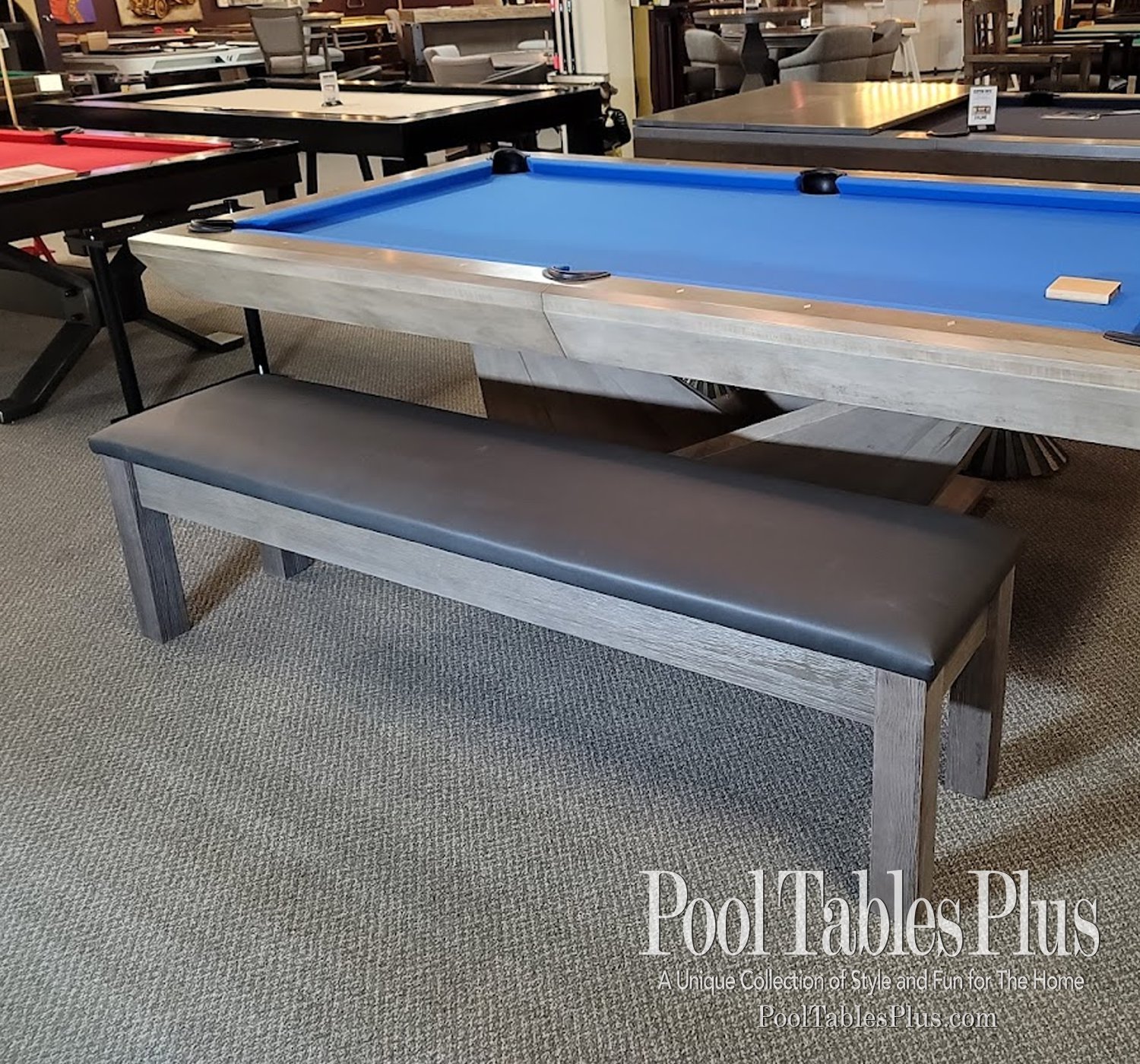 The Manhattan pool table is made from solid oak wood and shown in a Charcoal/Brown wood color with matte black steel legs. It is affordably priced in your coice of 7 or 8 foot size and includes the matching dining top. The Manhattan is also availabe in a brown wash color. It is built like a tank and will give you a lifetime of enjoyment. The 4 piece dining top adds functionality. The 20″ tall dining benches provide comfortable seating at the proper height and storage for all of your accessories.