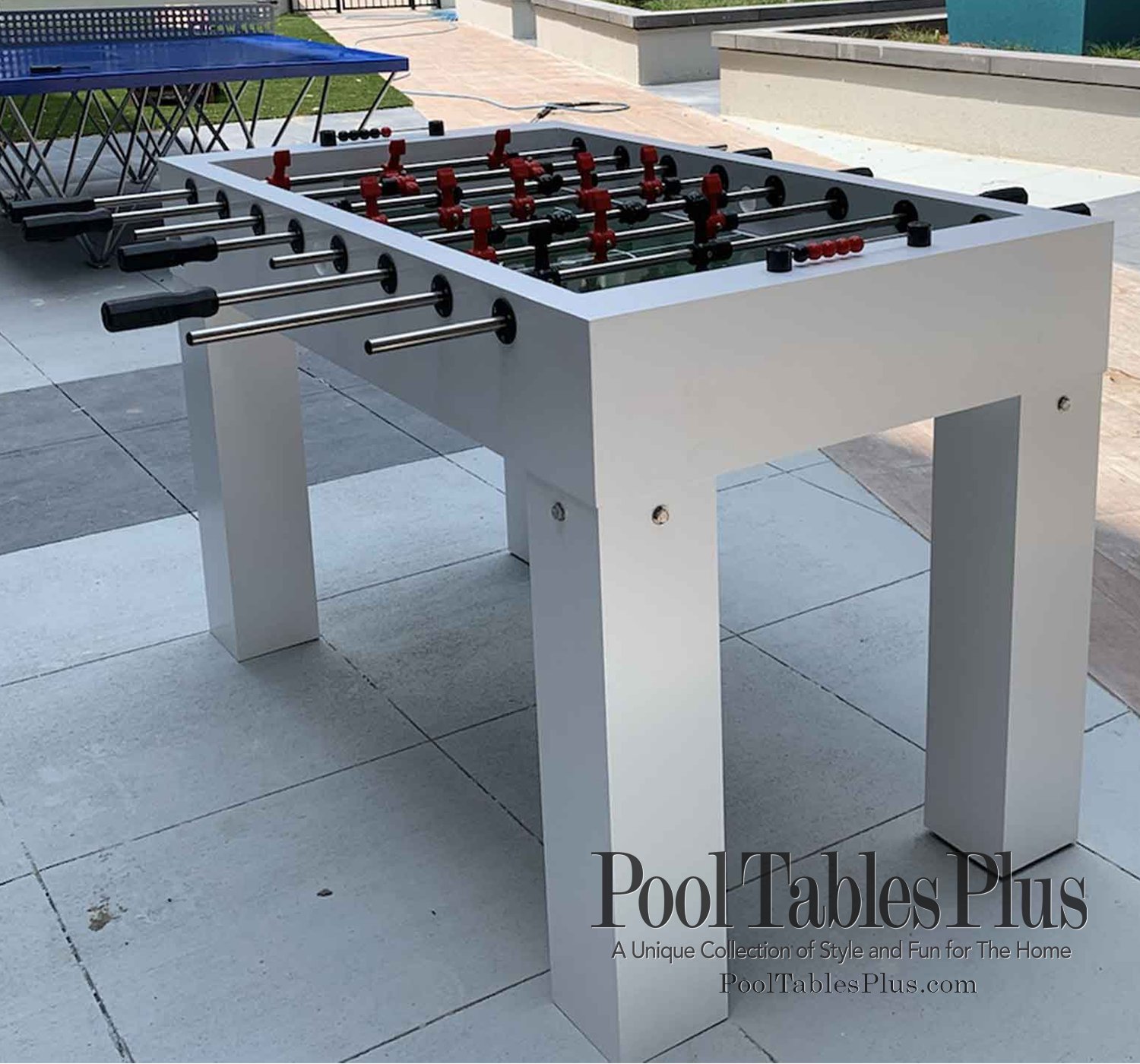 The game of Foosball or table soccer (football) has been around since 1921 in Europe making its way to America a few years later. Foosball is a fun game where you can play one-on-one or two-on-two team play. This is a fast paced and exciting game for all levels where you control your offensive and defensive players. Once you play, you’re hooked! Our outdoor tables let you enjoy this fun anywhere, including outside. Just like our pool tables, our Foosball tables are built for outdoor, all-weather conditions. If you have never played, you have to try this out!