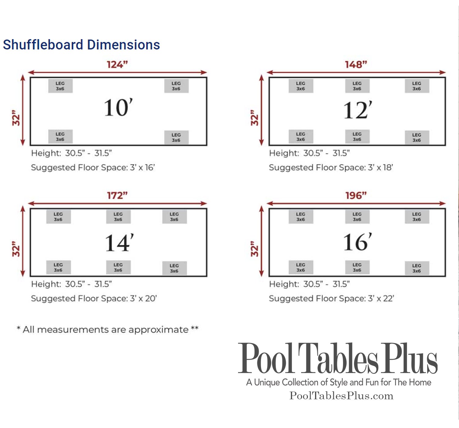 The shufflboard is shown and price in a 12′ length. Please call for pricing on the 10′, 14′ and 16′ sizes.
