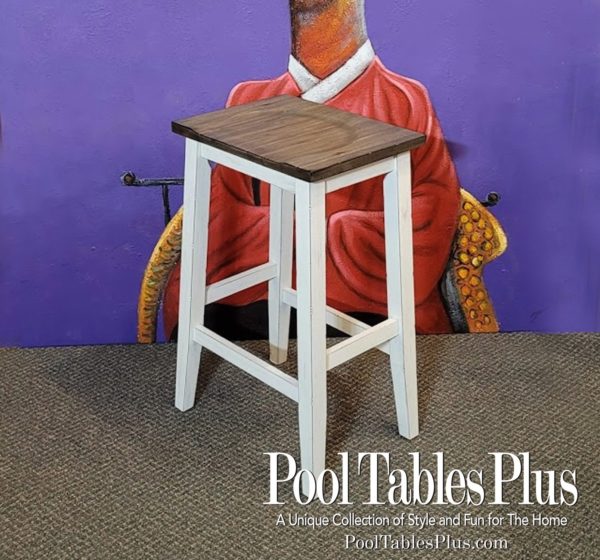 The Beach Haven Saddle Barstool made from heavily distressed wood and finished in rubbed white color with a wood seat finished in a grayish-brown color.