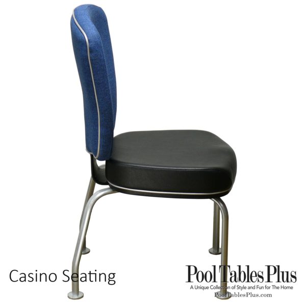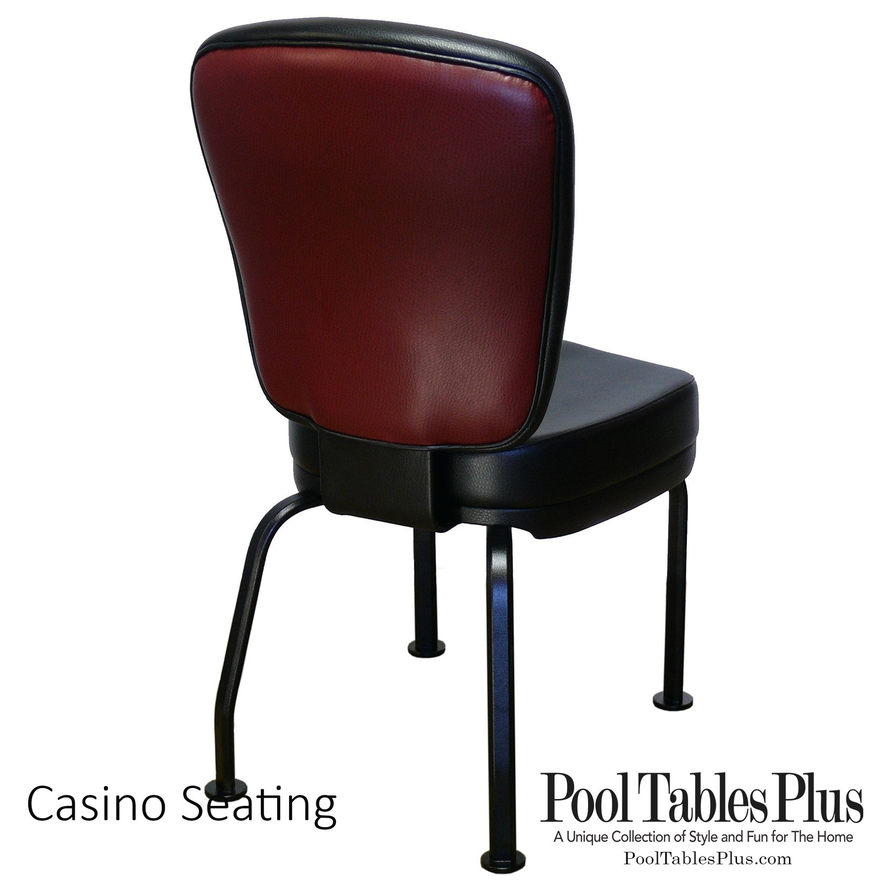 These top quality poker chairs are custom made in New Jersey for the casino industry. Ever wonder where the casinos get their comfortable, sturdy chairs? Well look no further than Pool Tables Plus for the best quality. These chairs can support up to 500 lbs of weight and the faux leather is nearly indestructable (over 500,000 double rub durability). Choose from 3 chair back styles, 7 metal color and many dozens of faux leather colors. These chairs are totally customizable…