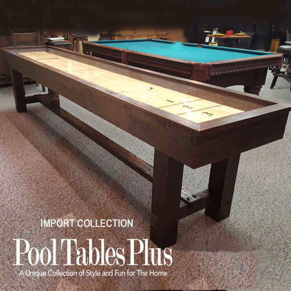 The Ramapo Shuffleboard Table is priced in a 9′ length but optionally available in a 12′ length for additional $400. It is made of solid Aspen with an elm veneer and finished in a weathered chestnut or silver mist color. The table has a 1.75″ thick x 16″ wide solid wood playing surface to provide great puck slide. Solid wood post legs with crossbeams provide a unique look and adds stability. Includes 4 red and 4 blue shuffle pucks, two side mounted scoring markers, can of powder, and a playfield brush. Great fun for the entire family!